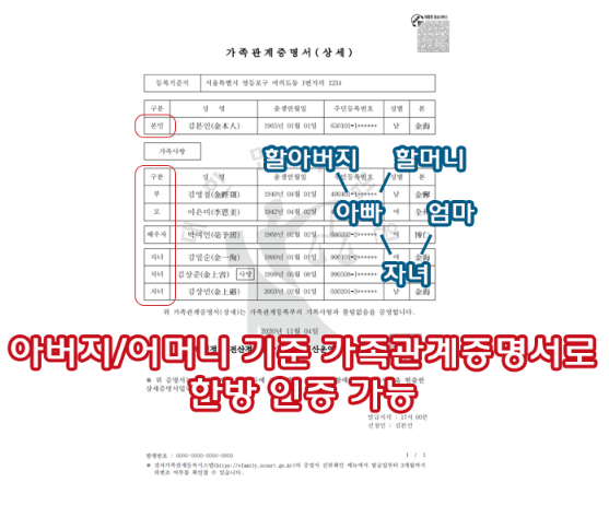 자녀 기준으로 가족관계증명서를 발급 받아, 부모님에 관한 정보를 증빙하고,